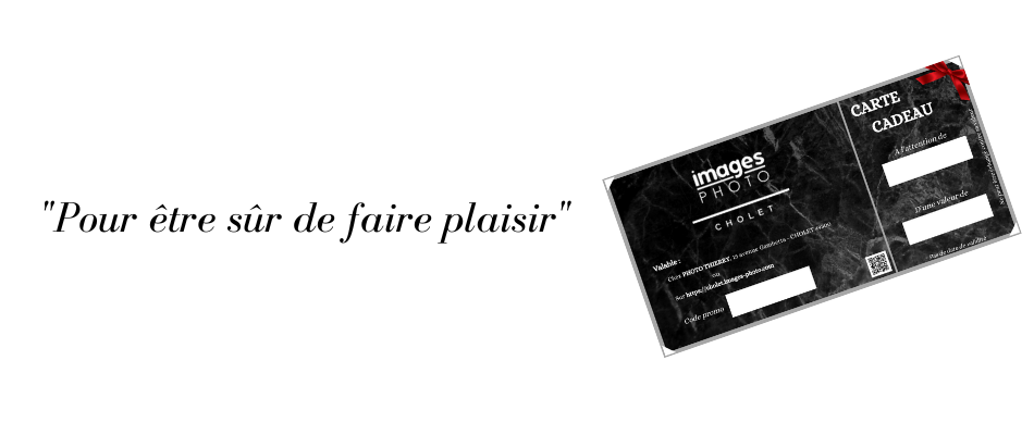 Disponibles avec des montants de 50€,100€, 150€, 200€ et 250€. Les cartes cadeaux Images Photo Cholet permettront de choisir parmi tous produits présents sur notre catalogue.